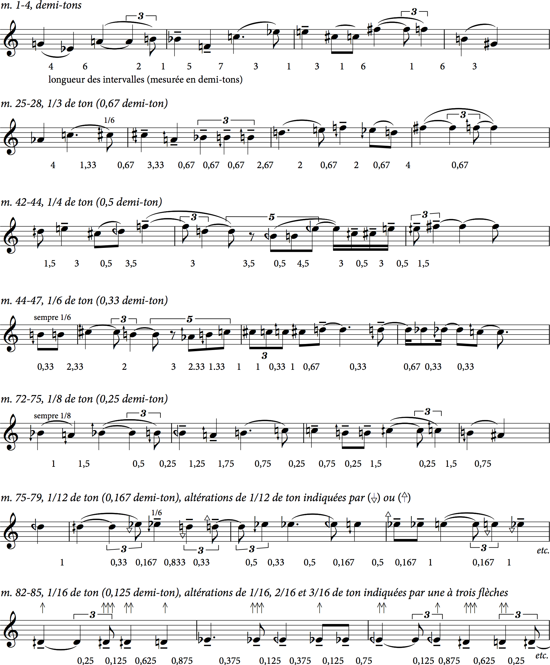 La figure 5 montre comment les intervalles « s’étranglent » et comment le chant funèbre à douze tons « s’étouffe de plus en plus12 » au fil de la pièce. Au début, l’intervalle le plus petit est un demi-ton, et tous les intervalles plus grands sont des multiples de cette unité de base. À la mesure 25, cette unité s’est réduite à un tiers de ton (0,67 demi-ton), qui sert à nouveau de socle de base pour des étendues plus grandes. À force de contours et de méandres, la mélodie est progressivement réduite à une étendue de moins d’un ton entier (mesure 82), le plus petit ton étant un 16ème de ton. Tout au long de la pièce, les mélodies funèbres sont entrecoupées de notes longues et de lignes altissimo quasi-improvisées, tirant parti des « registres extrêmes et des couleurs changeantes » de la trompette grâce à l’utilisation de diverses sourdines13. Ce rétrécissement des intervalles produit un malaise palpable, mais aussi un sentiment de deuil rendu d’autant plus intense par cette restriction des moyens d’expression.